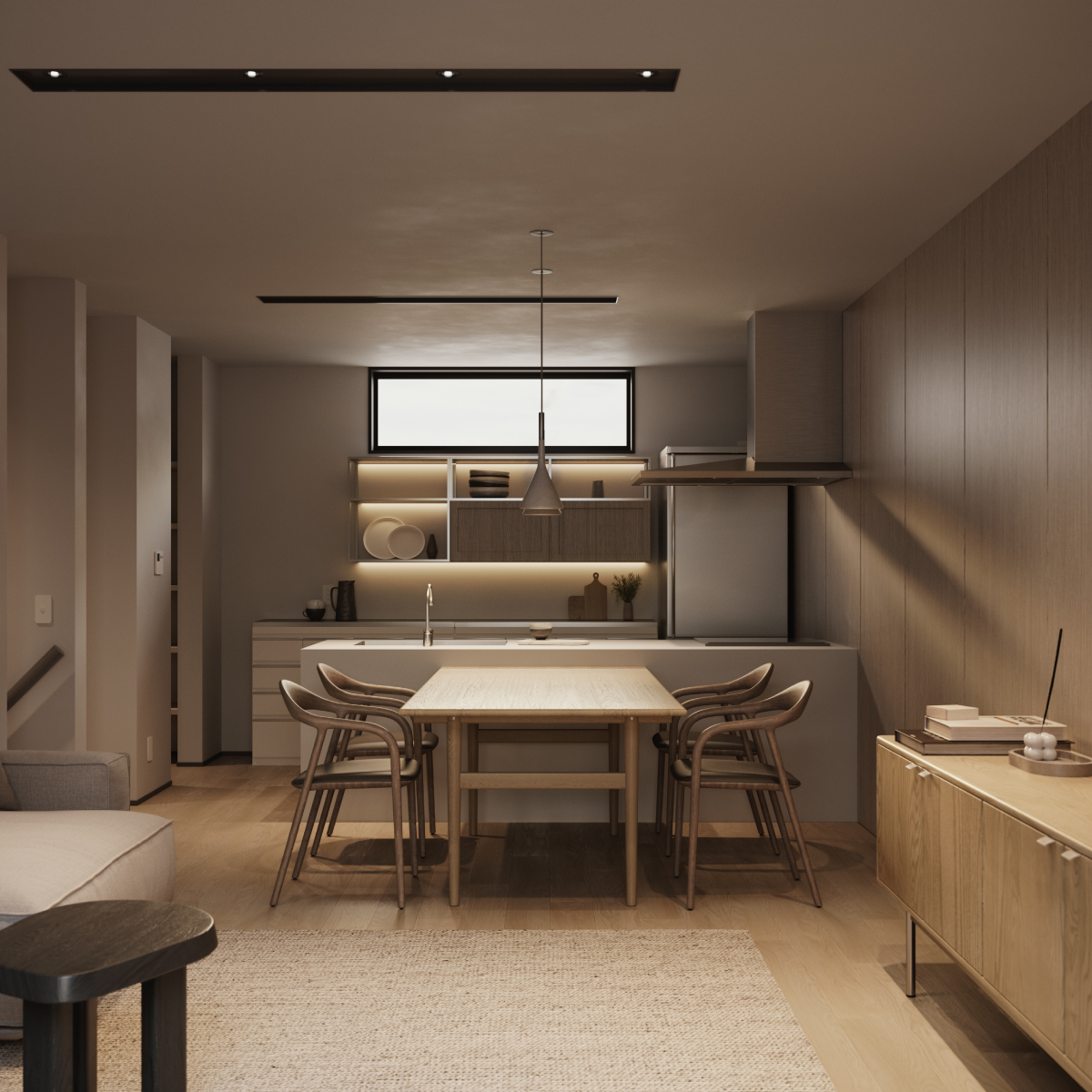 玄関、キッチンからダイニングへと視線と動きが自然に流れ、暮らしのリズムが整う。